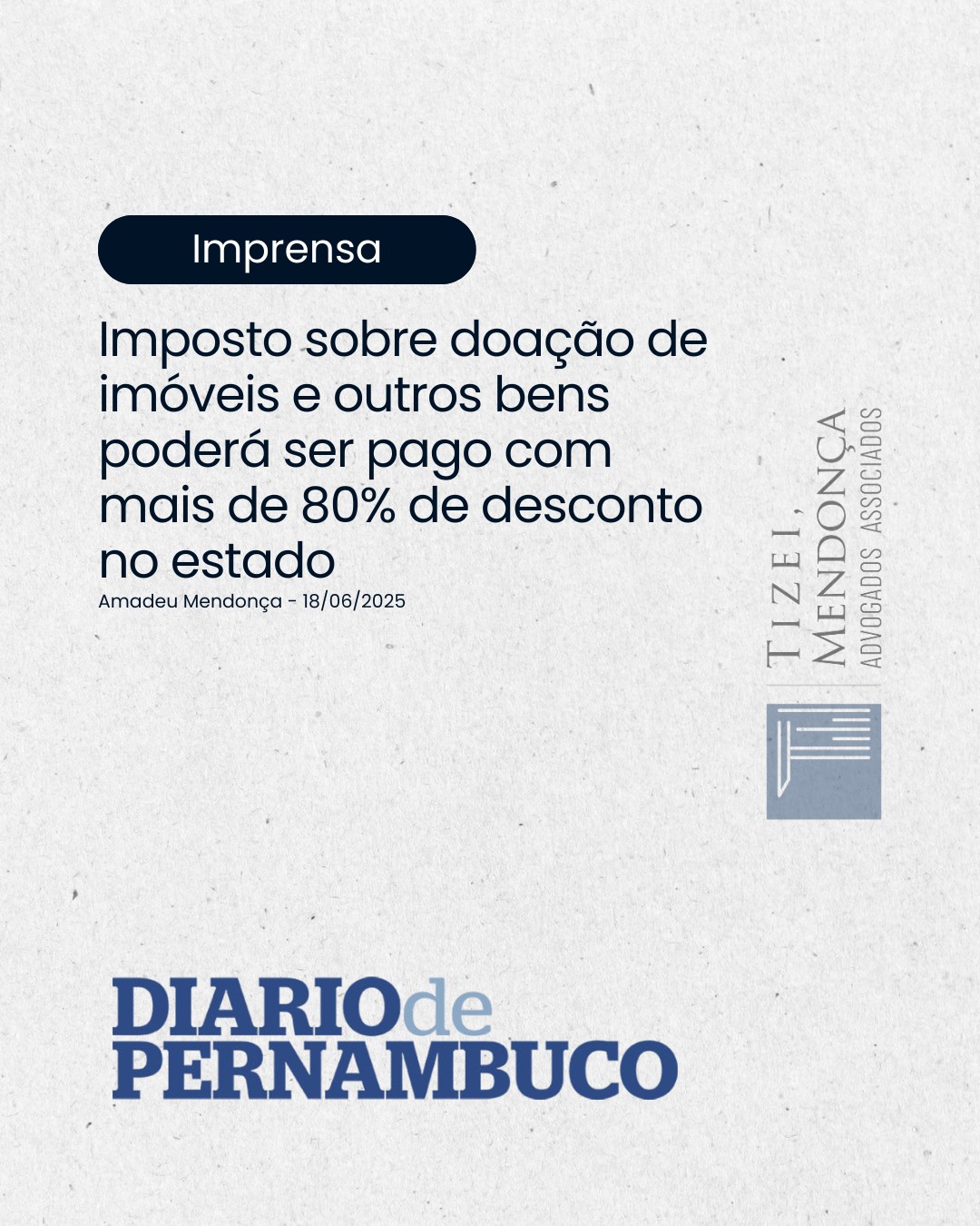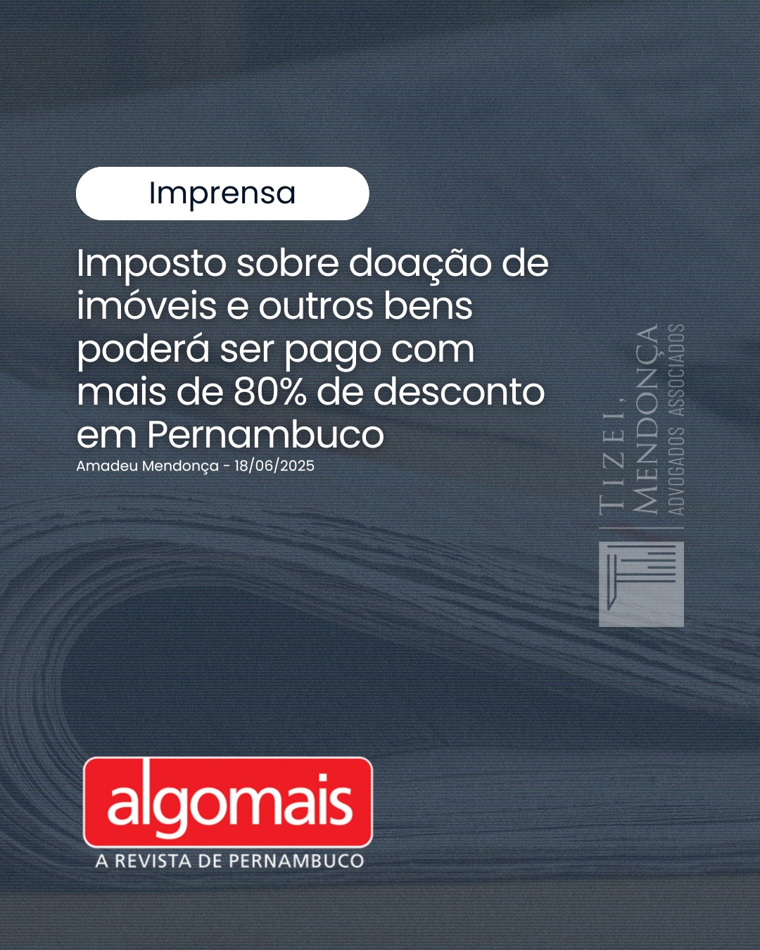 Nosso sócio, Amadeu Mendonça, participou como especialista na reportagem da Revista Algomais, também em 18 de junho de 2025, sobre o PLC 3005/2025 que reduz o ICD para 1% e 2% em Pernambuco. Ele detalha que a alíquota de 1% se aplica a bens de até R$ 317.412,45, com regime de parcelamento em até 10 … Leia mais